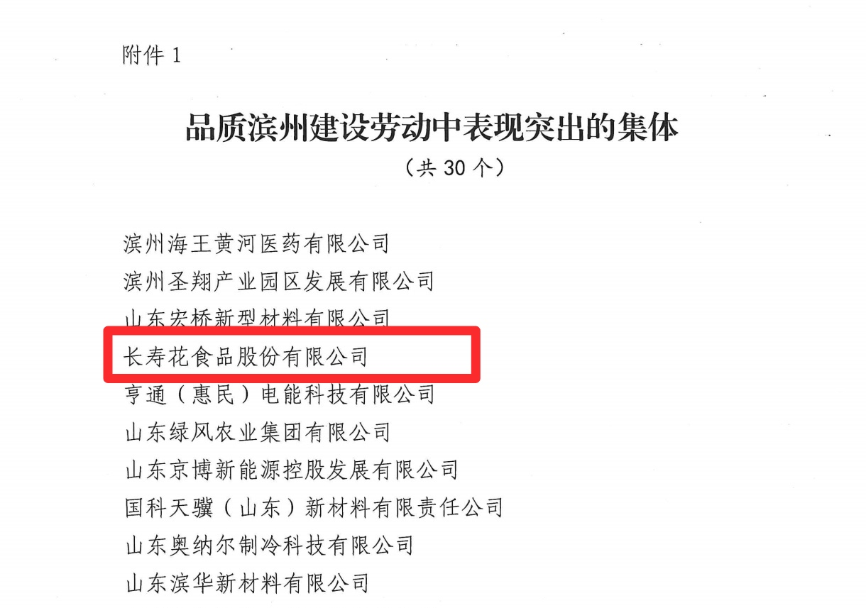 近日,滨州市总工会发布了《关于表扬在品质滨州建设劳动中表现突出的集体和个人的通报》,对在推动“品质滨州”建设中勇挑重担、创新实干的先进集体和个人予以通报表彰。长寿花食品凭借在品质滨州建设中的卓越表现和突出贡献,荣获“品质滨州建设劳动中表现突出的集体”荣誉表彰。