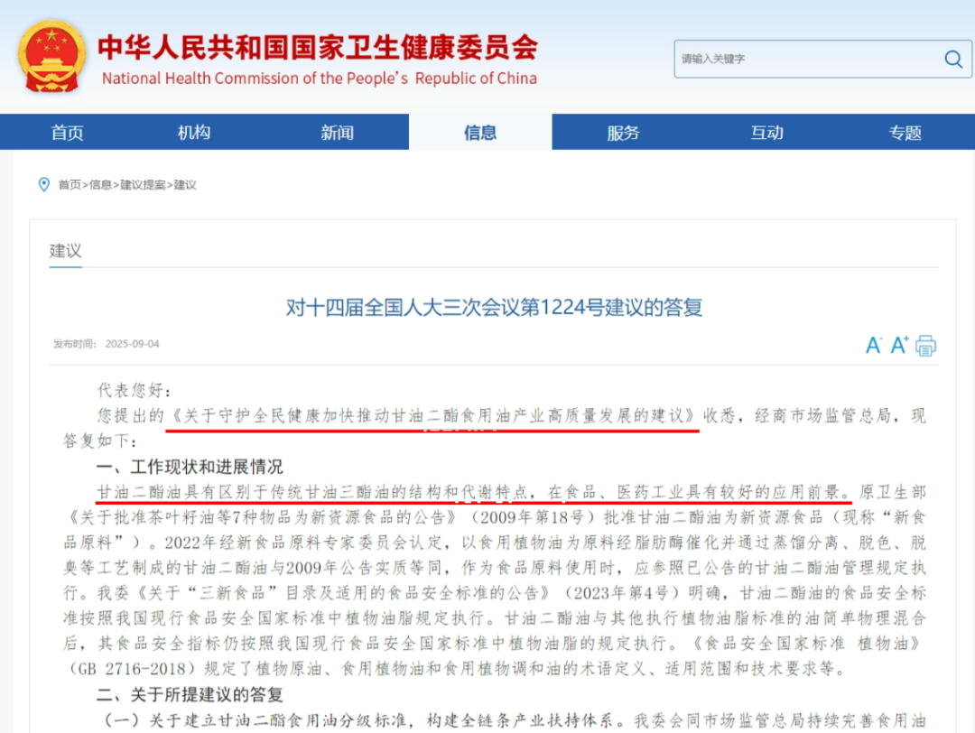 随着“健康中国”战略的发展,今年国家卫健委针对十四届全国人大三次会议第1224号建议——《关于守护全民健康加快推动甘油二酯食用油产业高质量发展的建议》作出了专题答复,明确将推动甘油二酯健康效应研究和产业发展关键技术突破,适时推进甘油二酯食用油标准体系建设,加大油脂营养健康科普和指导,引导产业健康发展。